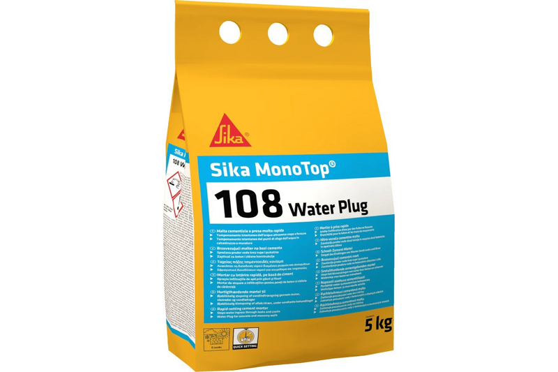 Sika Monotop 108 Water Plug is een cementgebonden mortel die speciaal is ontwikkeld voor het dichten van waterlekkages in beton en metselwerk, zelfs in het geval van stromend water. Dankzij de snelle uitharding is de Sika Monotop 108 ideaal voor situaties waarin een snelle afdichting vereist is.