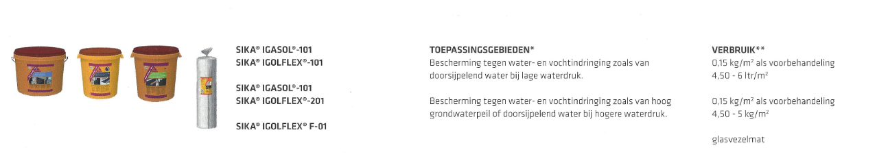 Sika Igolflex is geschikt voor waterdichting van alle soorten ondergrondse en bovengrondse betoncontructies door een high-build coating ter bescherming tegen water- en vochtindringing zoals van doorsijpelend water. Gebruik Sika Igolflex 101 bij doorsijpelend grondwater en bij hogere waterdruk bij een hoog grondwaterpeil. Zie Productblad Sika Igolflex 101 en voor meer informatie.