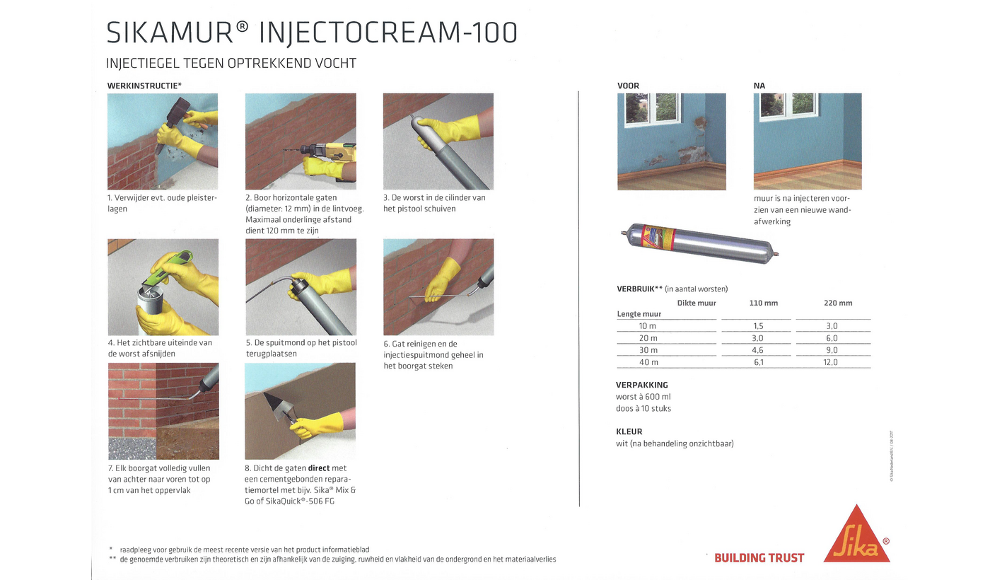 Sikamur Injectocream 100 kan gebruikt worden voor de behandeling van optrekkend vocht in praktisch alle typen gemetselde muren.
