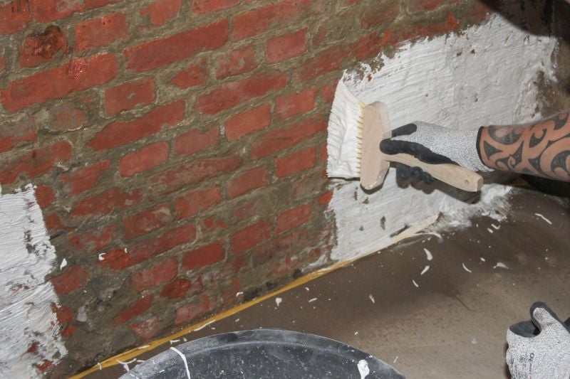 3. De eerste laag van +/- 1 mm krachtig aanbrengen met een brede, stijve borstel, op de nog natte primer.