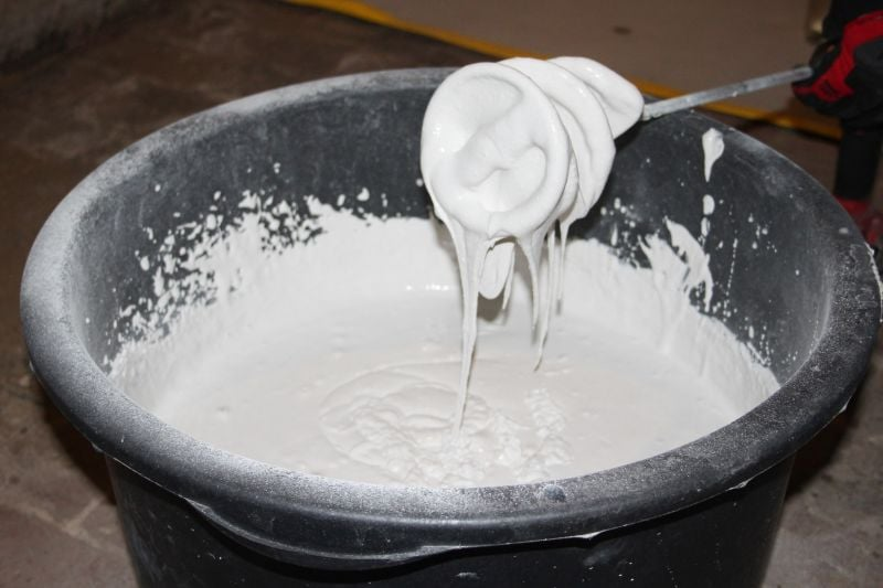 2. De benodigde hoeveelheid polymeercement voor de eerste laag (1 kg per 1.2 m²) mengen met zuiver water. Mengverhouding 400 ml water per kg. Meng met een traag draaiende mixer (500 toeren per minuut) tot een dik vloeibare, klontervrije massa en laat 2 minuten rusten. Terug oproeren voor gebruik. Het mengsel is 35 tot 45 minuten verwerkbaar, afhankelijk van de omgevingstemperatuur. Bij opstijven in de pot, nooit water toevoegen om de mengverhouding te respecteren: meng dus maximaal zo veel product als u kan aanbrengen binnen de verwerktijd.